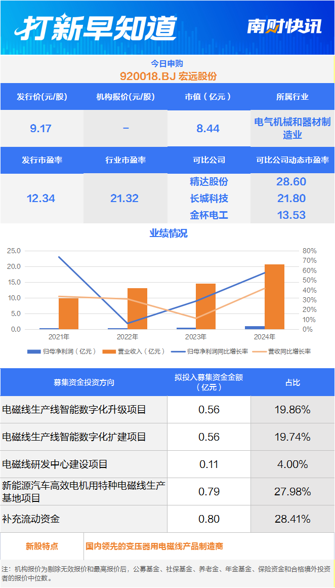 8月11日,可申购北交所的宏远股份(920018.BJ)。该公司主要从事电磁线的研发、生产和销售,产品主要包括换位导线、纸包线、漆包线、漆包纸包线、组合导线等多种品类,目前主要应用于高电压、大容量电力变压器、换流变压器和电抗器等大型输变电设备。