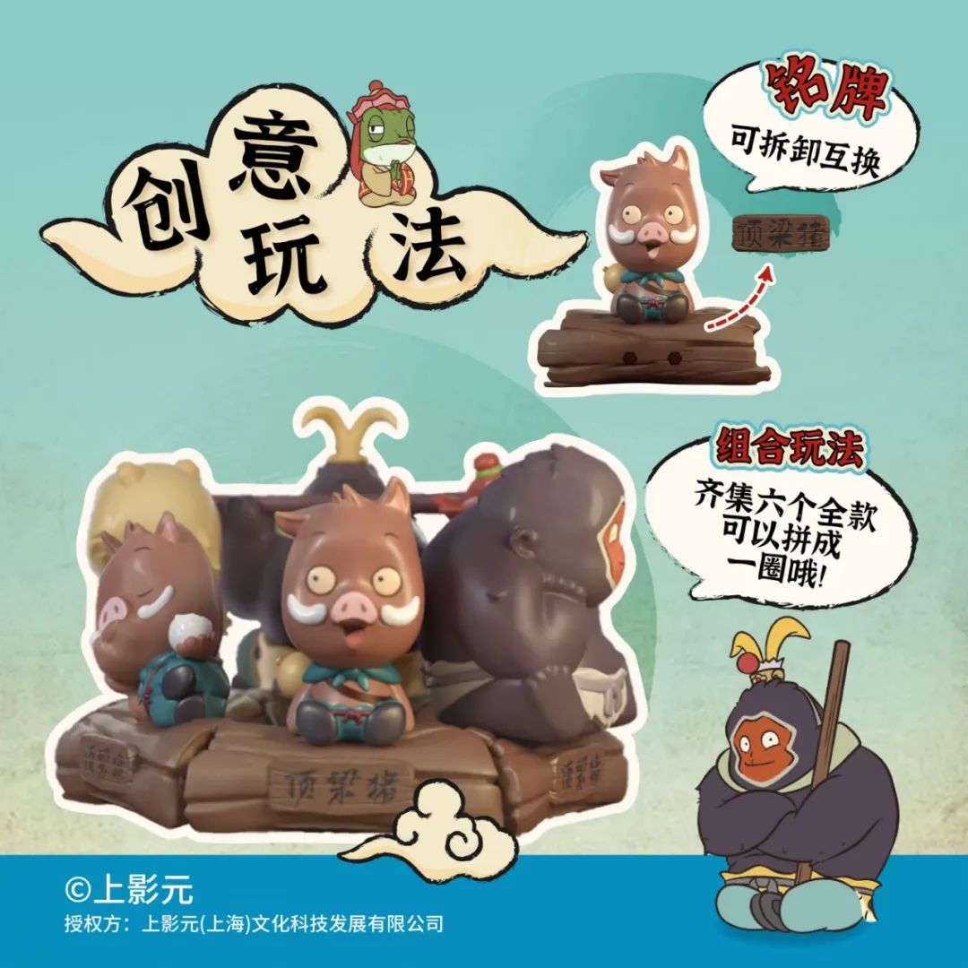 在木桩款盲盒的设计中,灵鼠动漫别出心裁地增加了一个套系,使各个角色的产品可以通过底座连接起来,组合为一个整体,借此增加收集性。此外,为了提高可玩性,他们在设计时还加入了可替换的名牌部件,并标注上 “行行猩”“顶梁猪”等贴合角色的谐音梗,增加产品的趣味性。金今表示,相关设计一经推出便收获了大量消费者肯定,选择“端盒”集齐所有角色的消费者不在少数。