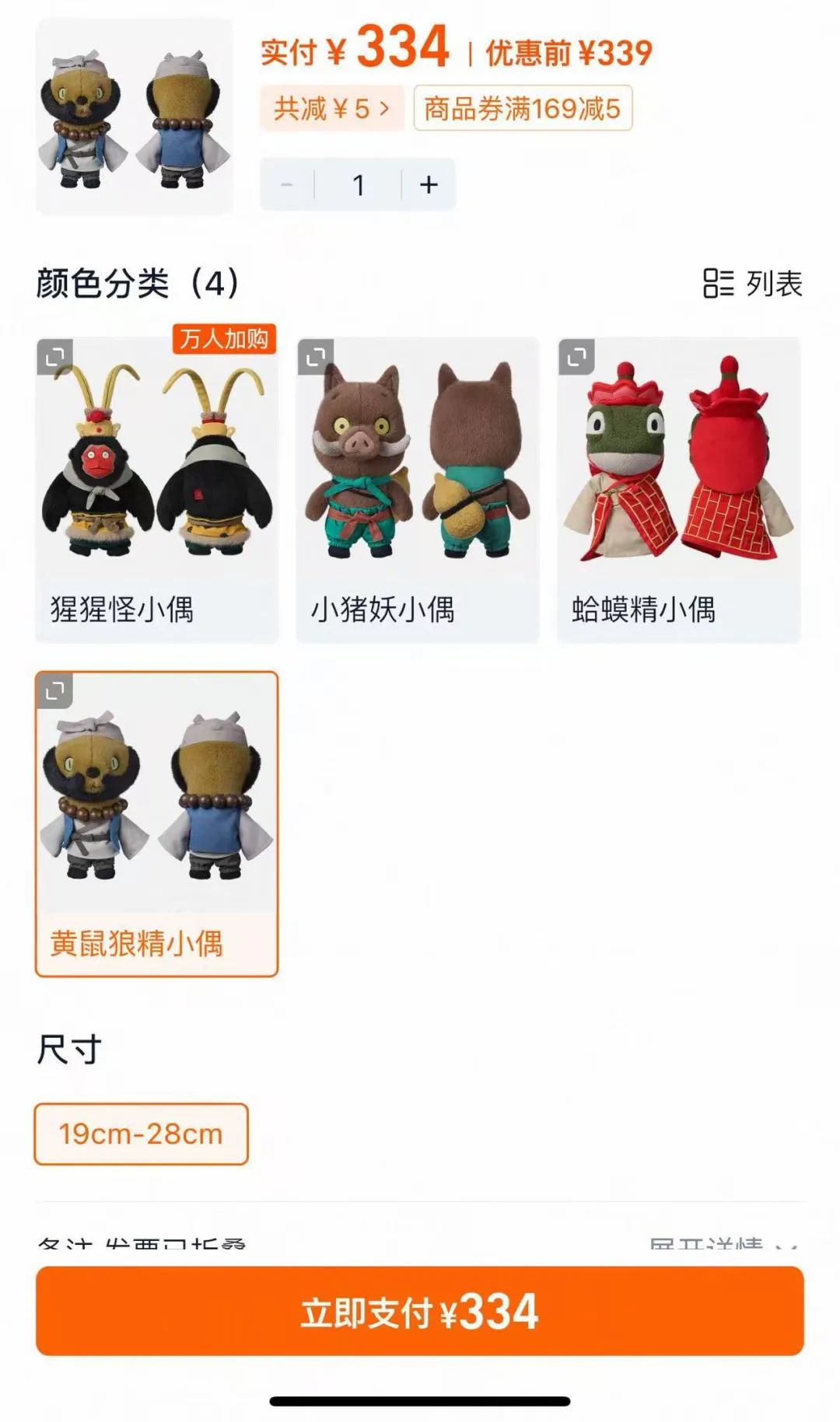8月11日上午10时,中新经纬在淘宝App找到了上述店铺, 发现李华看上的这款《浪浪山小妖怪》毛绒玩偶,四个角色标价在299元至359元之间,已售数量超6000个,黄鼠狼精显示缺货。这家店的《浪浪山小妖怪》挂偶,标价均为169元,已售数量超1万个,黄鼠狼精和小猪妖显示缺货。对于何时补货,该店客服表示目前尚未收到通知。8月11日17时许,中新经纬发现该店铺相关缺货产品已经补货。