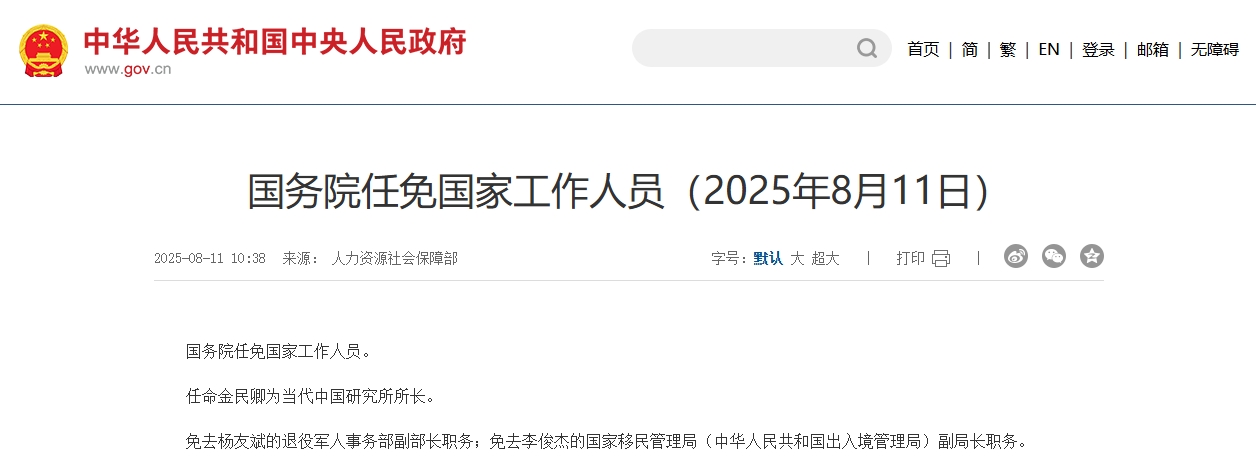 免去杨友斌的退役军人事务部副部长职务;免去李俊杰的国家移民管理局(中华人民共和国出入境管理局)副局长职务。