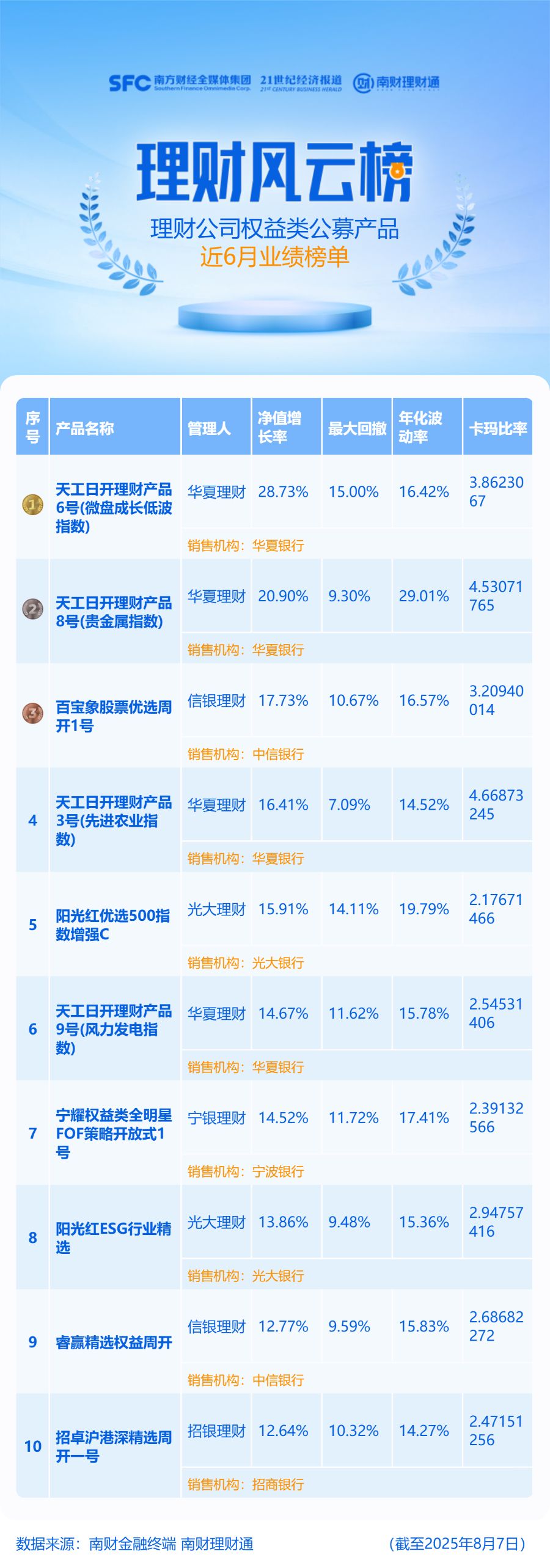 权益类产品范围为理财公司发行的公募权益类产品,统计截止日期为2025年8月7日,统计区间为近6月。