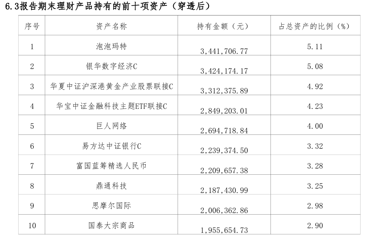 究其原因,产品在二季度增持了泡泡玛特、巨人网络等个股,其中泡泡玛特成为产品穿透后的第一大持仓资产,占比达到5.11%。2025年二季度,在IP产品的持续热销、海外市场的高速增长等多项利好下,泡泡玛特涨幅达到74.74%,为产品贡献了较高收益。此外,产品还持仓了黄金产业、金融科技主题、银行主题的ETF基金,同样在二季度为产品贡献了正向收益。