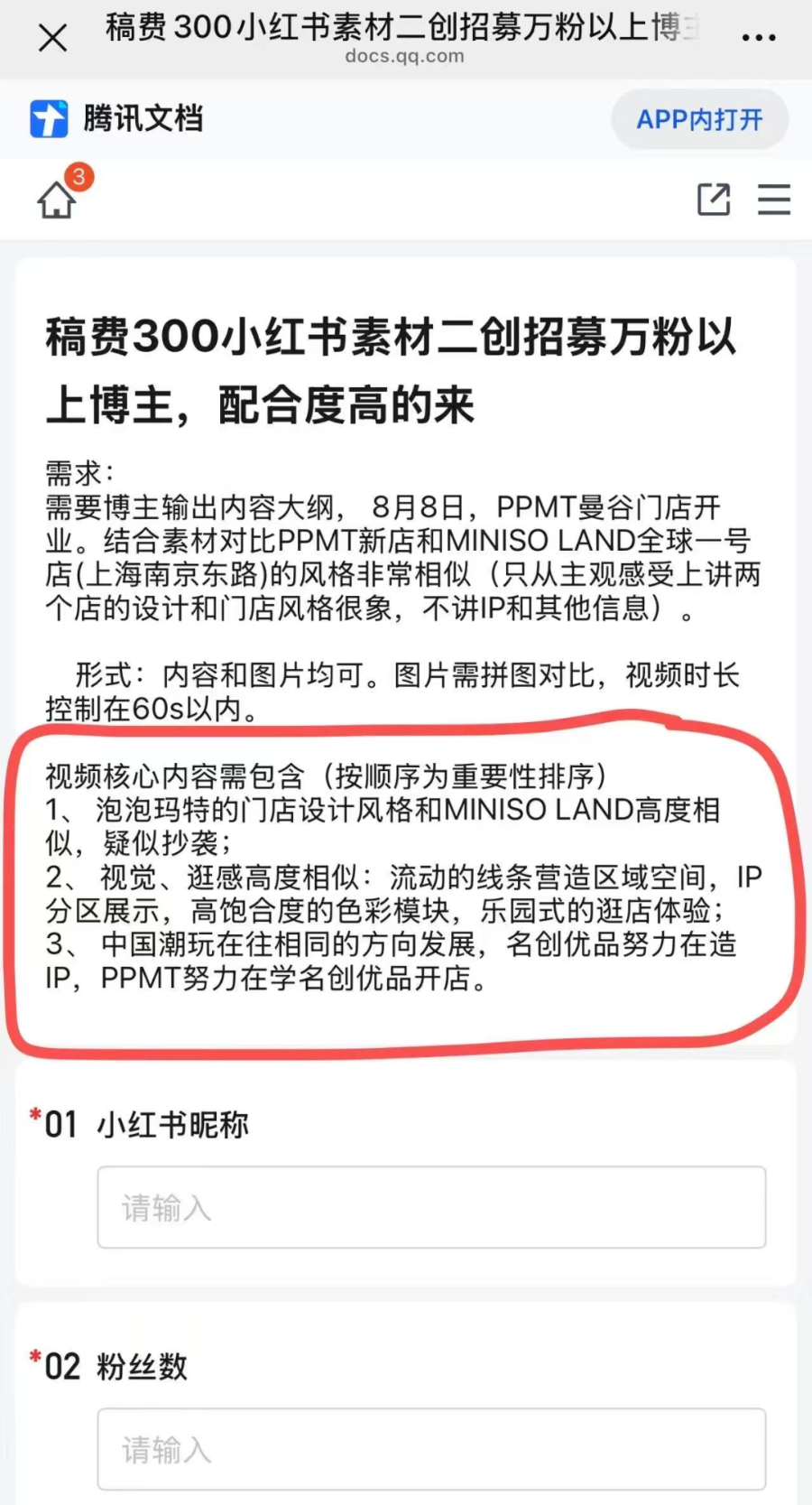 值得注意的是,社交媒体上有网友爆料,疑似有人以每条300元的价格招募博主,要求二创门店撞脸相关话题,需将内容引导至“疑似抄袭”,并在结尾“升华”为“名创优品在努力造IP,PPMT在努力学习名创优品开店”。