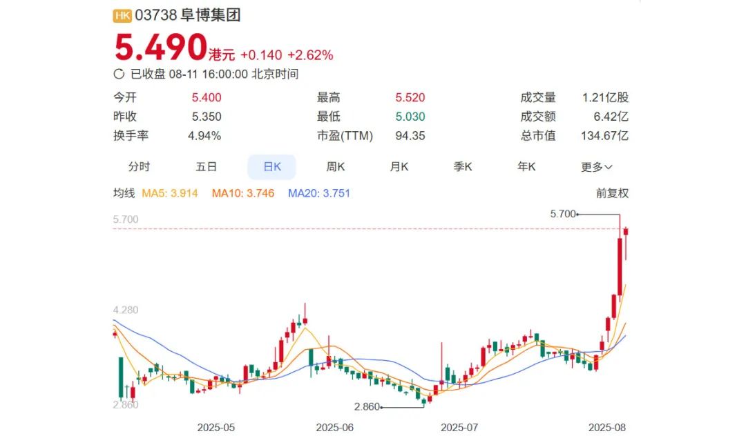 8月11日,王扬斌掌舵的阜博,市值已突破130亿港元,过去6个交易日,其飙升约50亿港币,涨幅在60%左右。