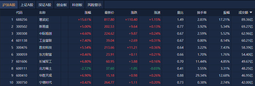 个股方面,寒武纪成交额超89亿元居首,新易盛、中际旭创、工业富联成交额靠前。