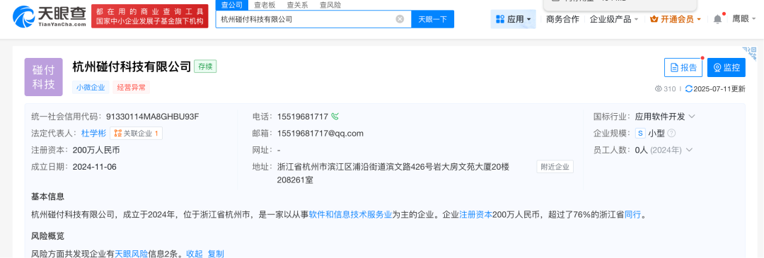 天眼查显示,杭州碰付科技有限公司成立于2024年11月,注册资本200万元,法定代表人为杜学彬,持股100%。