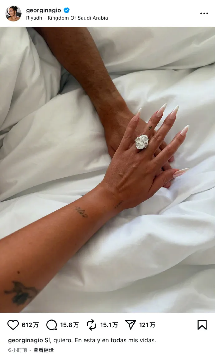 在此前的纪录片《我是乔治娜》中,C罗曾谈到了两人结婚一事:“我一直告诉她,‘等我们找到那个契机’,就像生活中很多事一样,她明白我的意思。”
