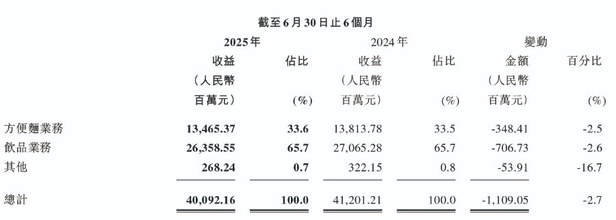 核心品类的销售额,都在下跌,方便面少卖3.5个亿,饮品业务则缩水7个亿,跌幅均在2.5%左右。