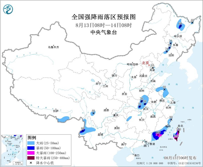 降水预报:8月13日08时至14日08时,广东东部、福建东部和南部、台湾岛大部等地有大到暴雨,其中,福建东南部、广东东南部、台湾岛东部和南部等地有大暴雨,台湾岛东部和南部的局地特大暴雨(250~390毫米)。