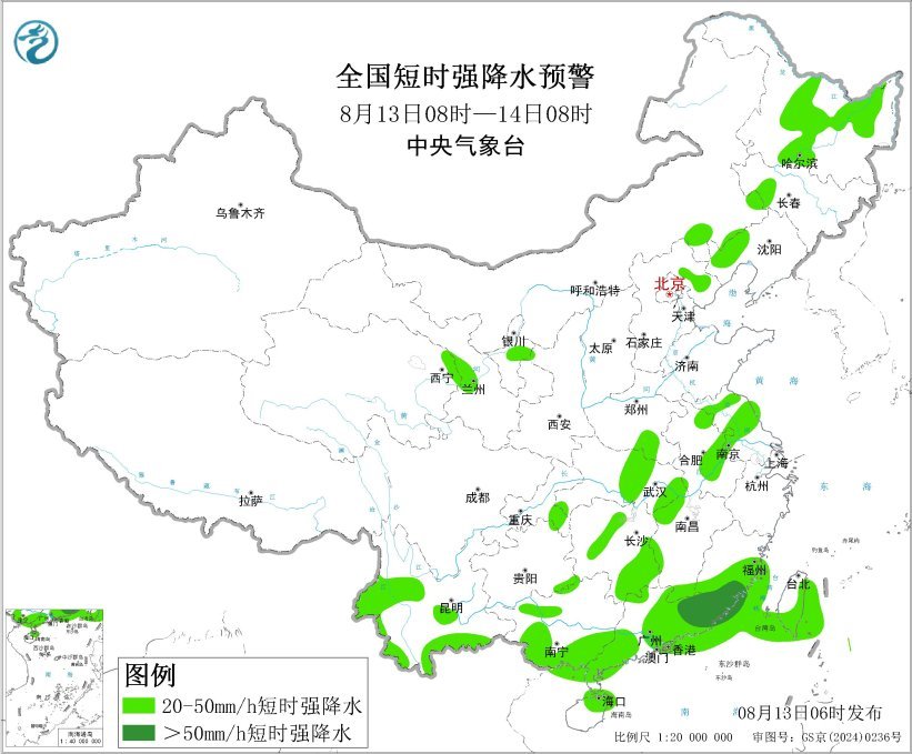 预计8月13日08时至14日08时,内蒙古东南部、东北地区北部和西部、苏皖北部、华南东部等地的部分地区将有8级以上雷暴大风或冰雹天气,其中,黑龙江东北部、辽宁西部、福建南部、广东东部等地的部分地区将有10级以上雷暴大风,最大风力可达11级以上;内蒙古东南部、东北地区北部和西部、江淮西部和北部、江汉、江南北部和西部、西南地区东部和南部、华南等地的部分地区将有小时雨量大于20毫米的短时强降水天气,其中,福建南部、广东东部等地的部分地区小时雨量大于50毫米,最大可达70毫米以上。