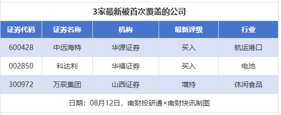 首次覆盖方面,8月12日券商共给出了3次首次覆盖,其中中远海特获得华源证券给予“买入”评级,科达利获得华福证券给予“买入”评级,万辰集团获得山西证券给予“增持”评级。