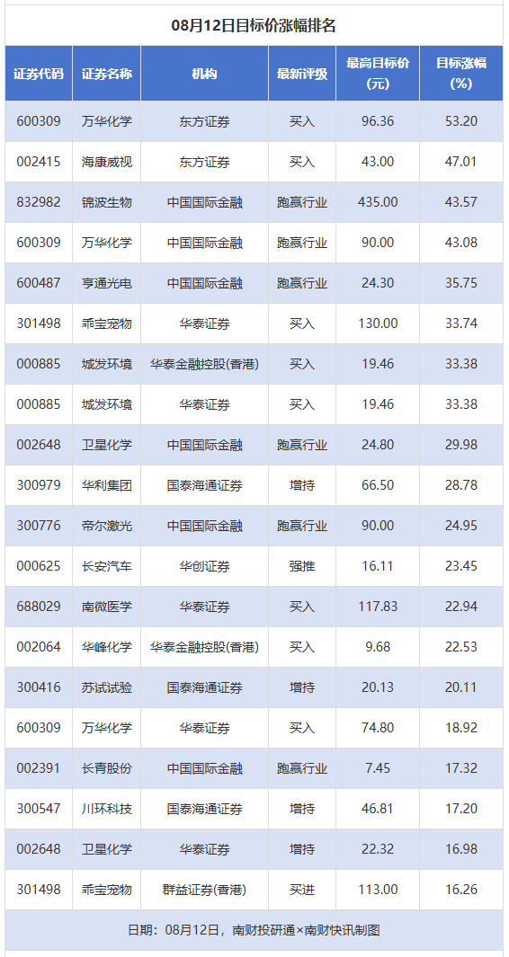 南财投研通数据显示,8月12日,券商给予上市公司目标价共26次,按最新收盘价计算,目标价涨幅排名居前的公司有万华化学、海康威视、锦波生物,目标价涨幅分别为53.20%、47.01%、43.57%,分别属于化学制品、计算机设备、医疗美容行业。