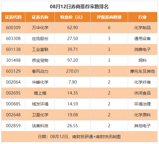 从券商推荐家数来看,8月12日有46家上市公司得到券商推荐,其中万华化学获得6家推荐,应流股份、工业富联等获得3家推荐。