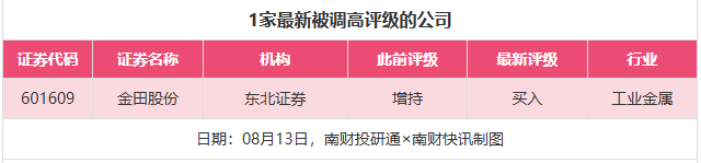 评级调高方面,8月13日,券商调高上市公司评级达到1家次,东北证券对金田股份的评级从“增持”调高至“买入”。