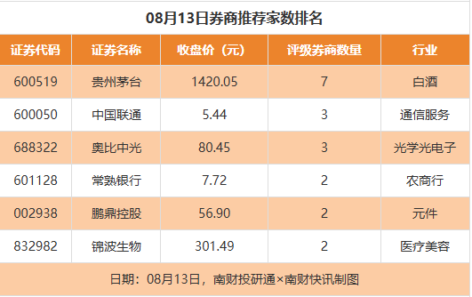 从券商推荐家数来看,8月13日有28家上市公司得到券商推荐,其中贵州茅台获得7家推荐,中国联通获得3家推荐,奥比中光获得3家推荐。