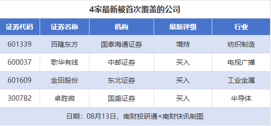首次覆盖方面,8月13日券商共给出了4次首次覆盖,其中百隆东方获得国泰海通证券给予“增持”评级,歌华有线获得中邮证券给予“买入”评级,金田股份获得东北证券给予“买入”评级,卓胜微获得国盛证券给予“买入”评级。
