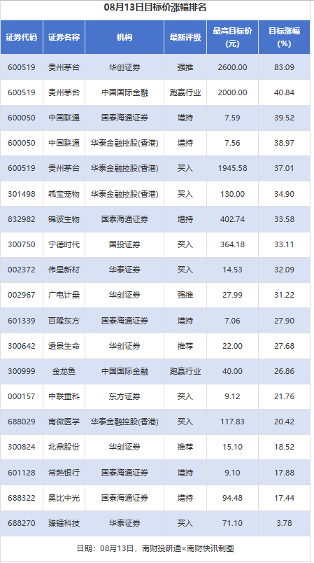 南财投研通数据显示,8月13日,券商给予上市公司目标价共19次,按最新收盘价计算,目标价涨幅排名居前的公司有贵州茅台、中国联通,目标价涨幅分别为83.09%、39.52%,分别属于白酒、通信服务行业。