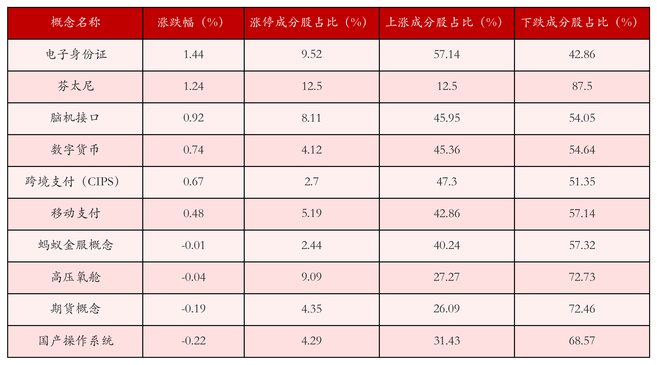 根据A股概念涨跌幅与所对应的股票池综合分析,涨幅靠前的三个概念板块分别为:电子身份证、芬太尼与脑机接口。排名前10位的概念板块相关数据见下表: