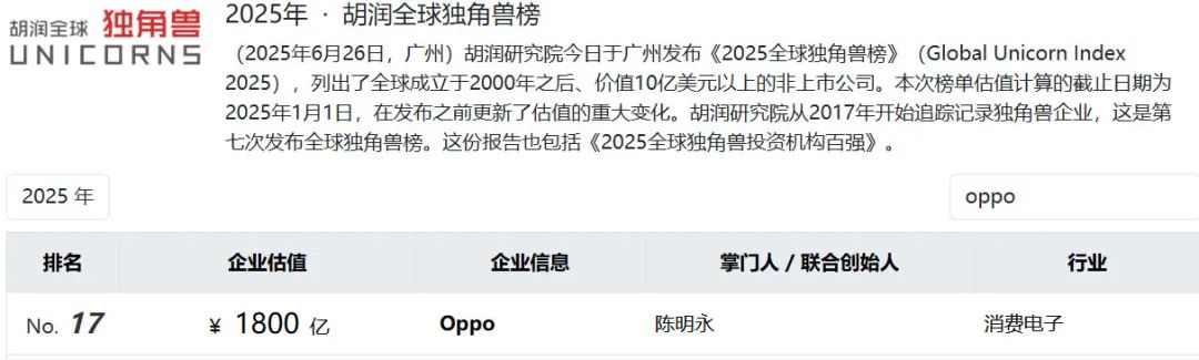 掌舵者陈明永,为人低调,这样一位不愿站在聚光灯下的人,将OPPO的生意做到了全球。据《胡润全球独角兽榜》,OPPO估值高达1800亿元。