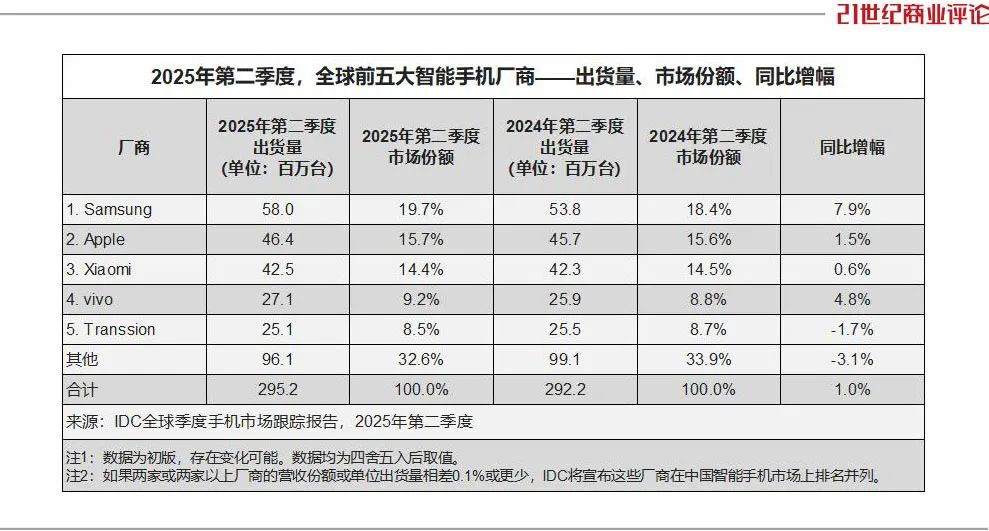IDC数据显示,2025年4至6月,全球前五大手机厂商中,没有OPPO的位置。2024年同期,其以9%市占率,和vivo一起并列第四。