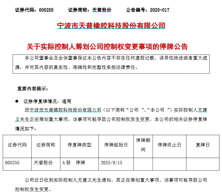 8月14日晚间,汽车橡胶管路行业龙头天普股份(605255.SH)突发公告称,公司实际控制人尤建义正在筹划重大事项,可能导致公司控制权发生变更。为确保信息披露公平性,公司股票自8月15日(周五)起停牌,预计停牌时间不超过2个交易日。