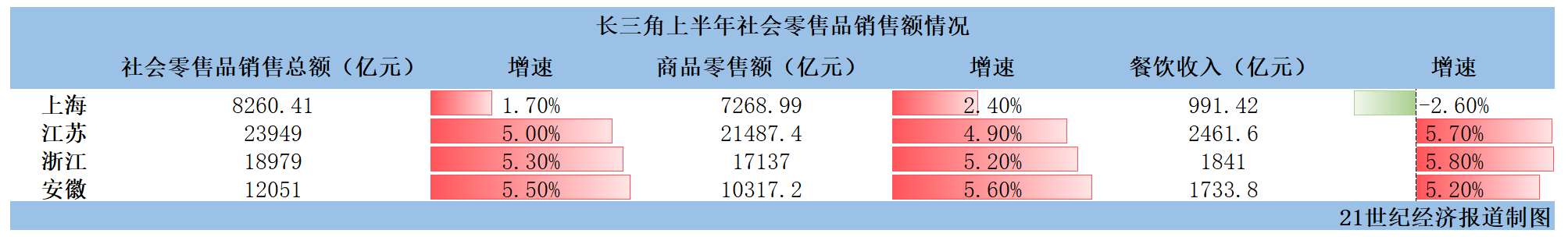 江苏、浙江、安徽上半年社零增速均达5%及以上。其中,浙江社零总额为18979亿元,同比增长5.3%;安徽社零总额为12051亿元,同比增长5.5%;江苏社零总额同比增长5%。