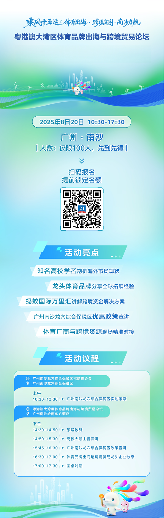 借第十五届全国运动会(简称十五运会)在粤港澳三地联合举办的东风,粤港澳大湾区体育产业正迎来前所未有的发展机遇!为深度探讨体育品牌全球化战略与跨境贸易创新路径,由十五运会和残特奥会广州赛区执委会、广州市南沙区商务局和广州市南沙区文化广电旅游体育局主办,南方财经全媒体集团、广州市南沙区人民政府龙穴街道办事处承办,广东省跨境电子商务协会、广东省体育设施制造商协会、广东广州报关协会协办的“粤港澳大湾区体育品牌出海与跨境贸易论坛暨广州南沙龙穴综合保税区招商推介会”,将于2025年8月20日在广州南沙隆重举行。