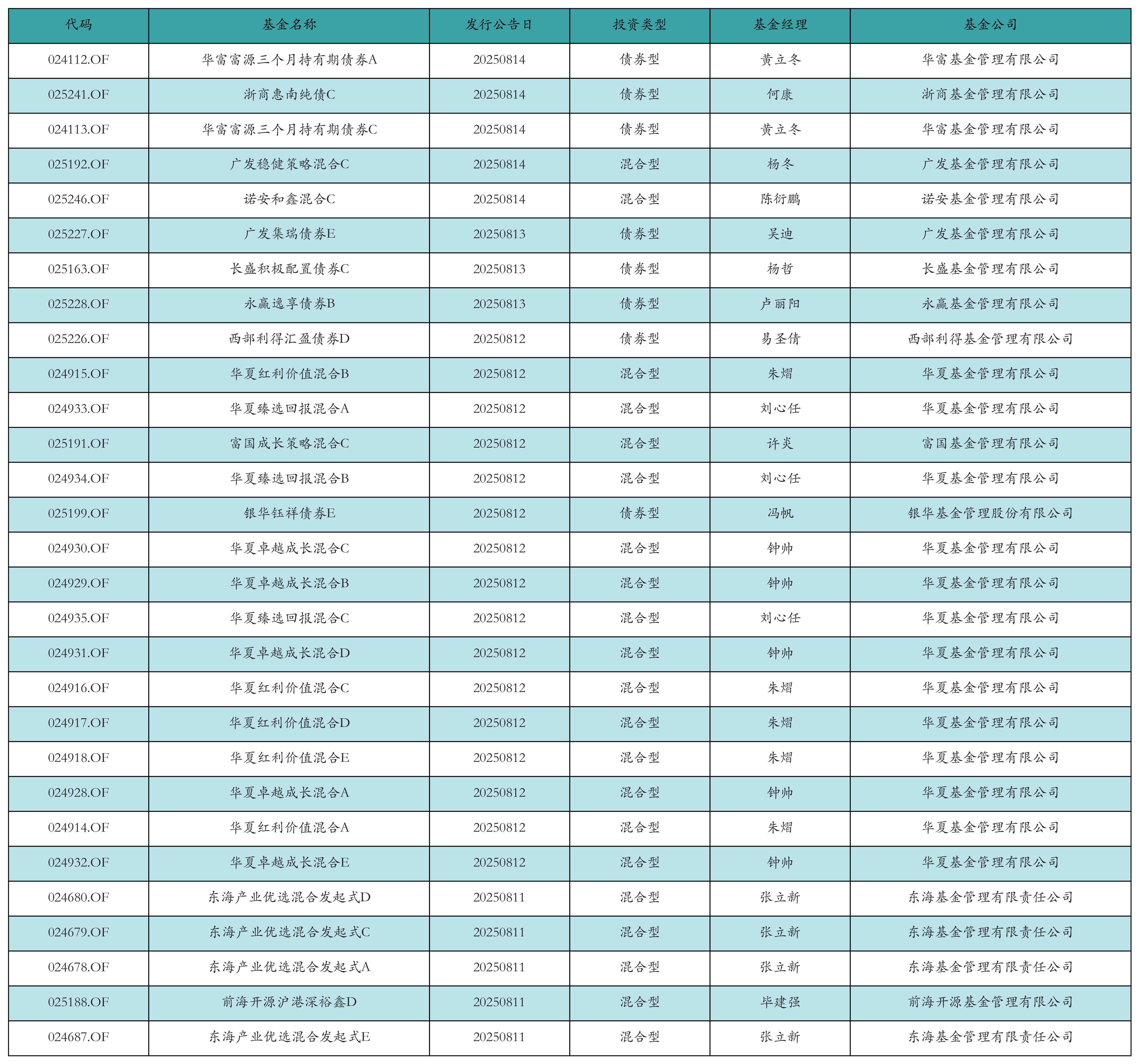 上周有29只新基金发行,分别为:华富富源三个月持有期债券A、浙商惠南纯债C、华富富源三个月持有期债券C、广发稳健策略混合C、诺安和鑫混合C、广发集瑞债券E、长盛积极配置债券C、永赢逸享债券B、西部利得汇盈债券D、华夏红利价值混合B、华夏臻选回报混合A、富国成长策略混合C、华夏臻选回报混合B、银华钰祥债券E、华夏卓越成长混合C、华夏卓越成长混合B、华夏臻选回报混合C、华夏卓越成长混合D、华夏红利价值混合C、华夏红利价值混合D、华夏红利价值混合E、华夏卓越成长混合A、华夏红利价值混合A、华夏卓越成长混合E、东海产业优选混合发起式D、东海产业优选混合发起式C、东海产业优选混合发起式A、前海开源沪港深裕鑫D、东海产业优选混合发起式E,详情见下表: