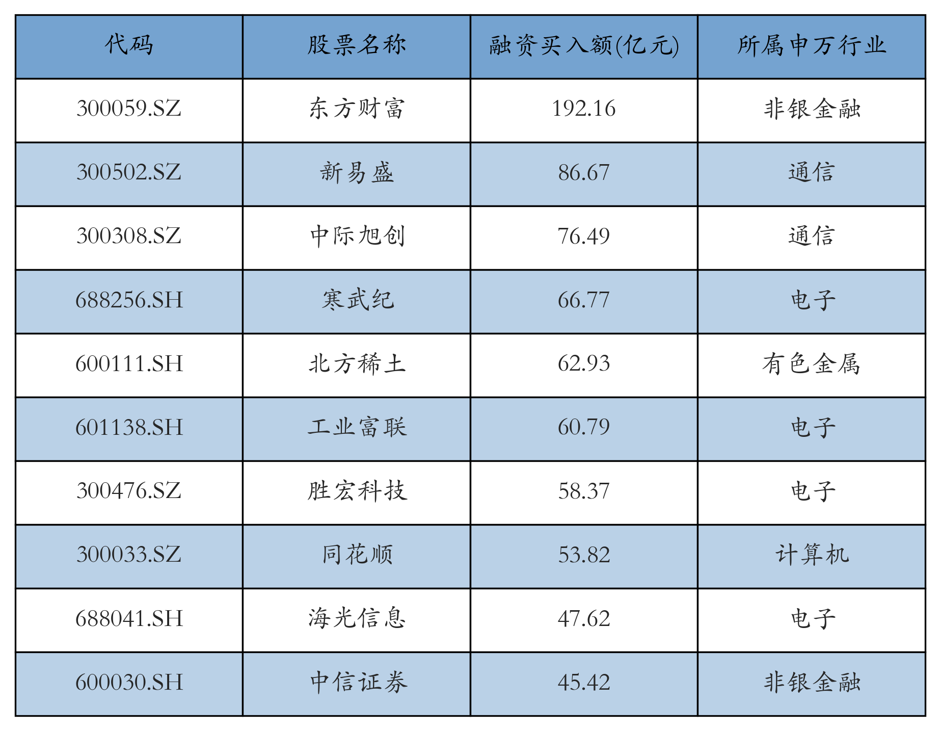 上周两市共有3445只个股有融资资金买入,共有194只个股买入金额超10亿元,其中东方财富、新易盛、中际旭创排名前三,买入金额分别192.16亿元、86.67亿元、76.49亿元。融资买入额前10个股详情见下表: