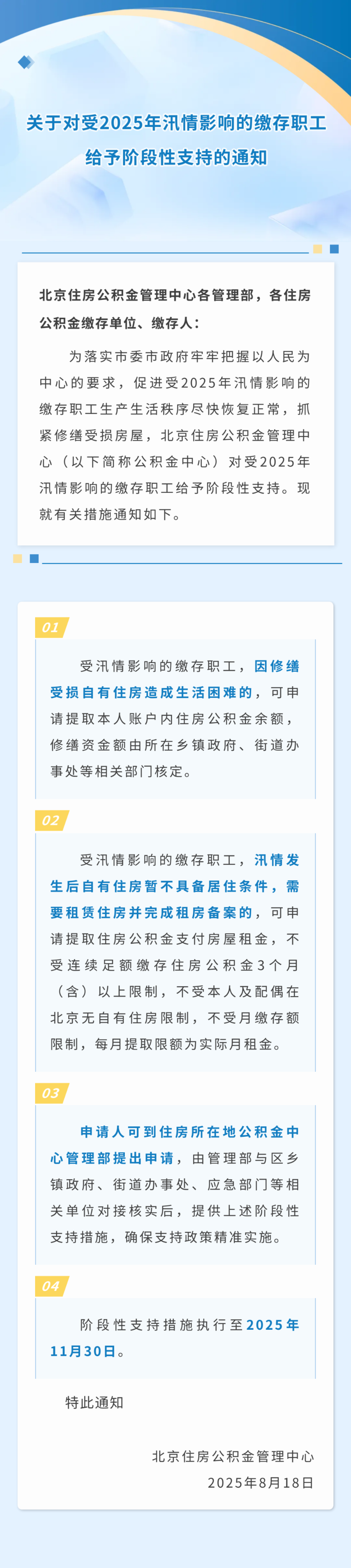 今天,北京住房公积金管理中心发布关于对受2025年汛情影响的缴存职工给予阶段性支持的通知,详情如下: