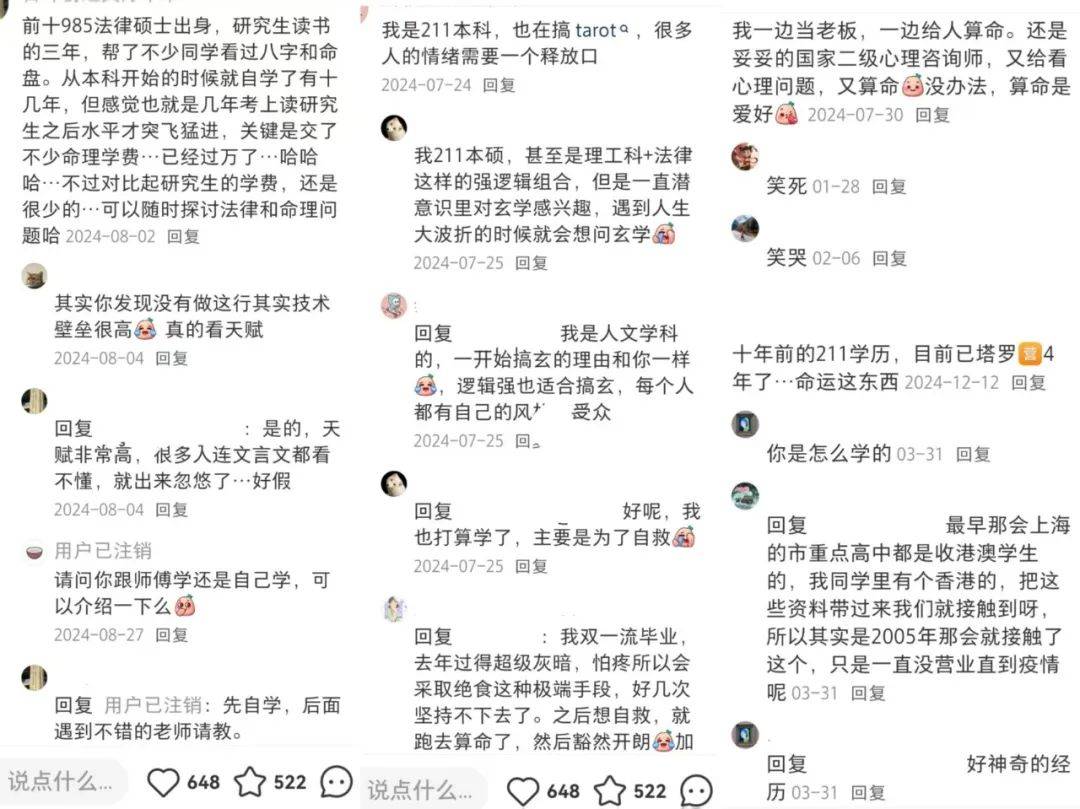 而小红书玄学帖子下的评论,也能显示许多玄学从业者及追随者正是高知群体。