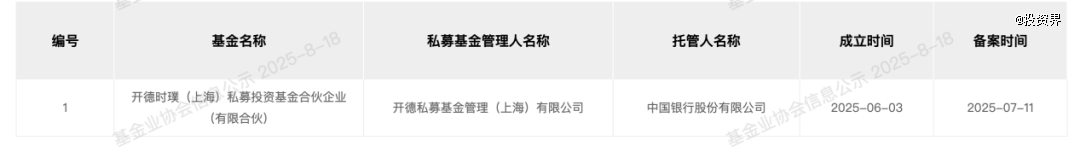 中国证券投资基金业协会显示,开德时璞(上海)私募投资基金合伙企业(有限合伙)(简称:开德时璞(上海))成立于2025年6月,注册地在上海浦东市,基金类型是“股权投资基金”,币种为人民币现钞,开德私募基金管理(上海)有限公司(简称:开德(上海))为基金管理人,背后正是KKR。