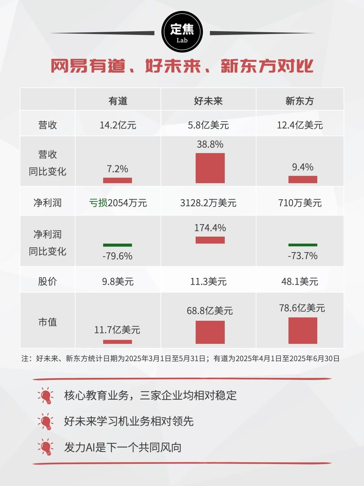 对比好未来和新东方,三家教育企业的共性在于,核心教育业务均相对稳定,AI是下一个角逐方向。