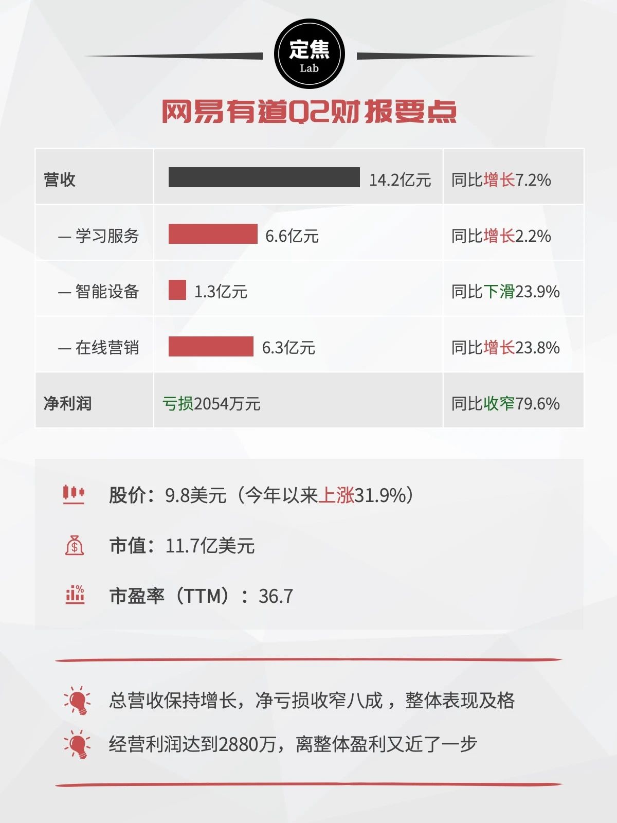 8月14日,网易有道发布截至2025年6月30日的二季度财报:实现净收入14.2亿元,同比增长7.2%;毛利润6.1亿元,同比下降4.3%;经营利润2880万元,去年同期为经营亏损7260万元;净亏损2054万元,同比收窄79.6%。