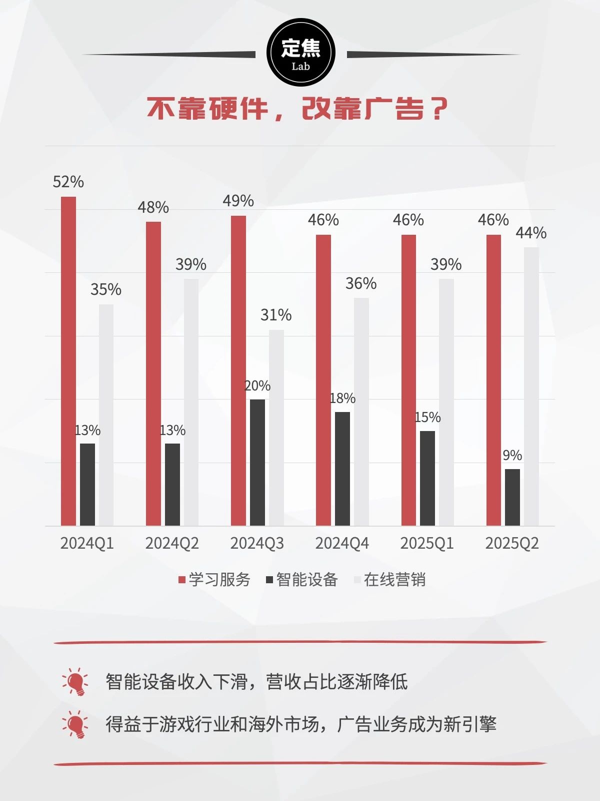 对比近六个季度的各业务营收占比情况,不难看出,网易有道智能设备陷入“卖不动”处境,收入下滑,营收占比逐渐降低。