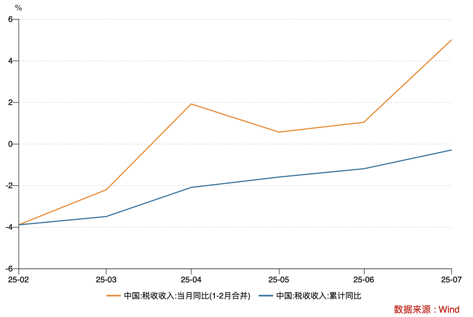 受物价低迷、国内有效需求不足、房地产市场深度调整、出口退税大增等多方面因素影响,今年上半年我国一般公共预算收入为负增长。随着我国经济的平稳运行,财政收入作为经济增长的重要产出,7月财政收入增速回升幅度较大。尤其是近期“反内卷”工作改善企业盈利预期、上证指数创新高带来财富效应等,均有助于财政收入增速的回升。