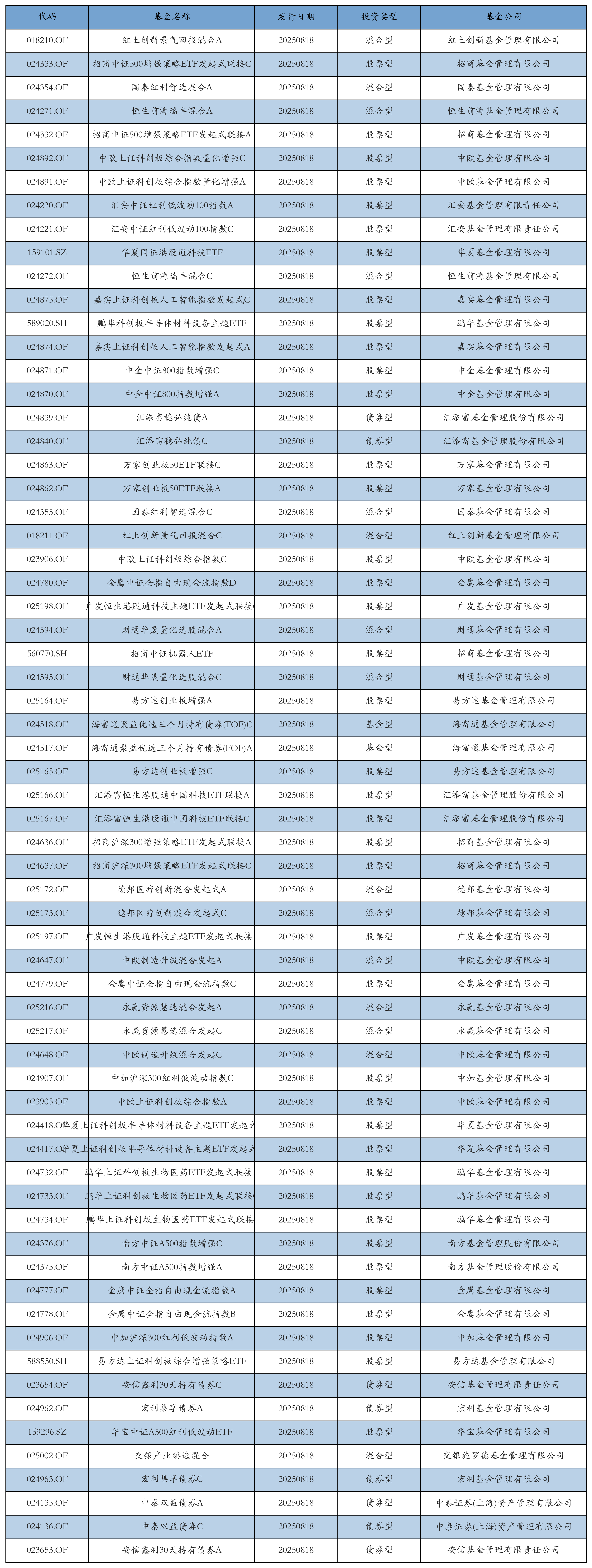 昨日有65只新基金发行,分别为:红土创新景气回报混合A、招商中证500增强策略ETF发起式联接C、国泰红利智选混合A、恒生前海瑞丰混合A、招商中证500增强策略ETF发起式联接A、中欧上证科创板综合指数量化增强C、中欧上证科创板综合指数量化增强A、汇安中证红利低波动100指数A、汇安中证红利低波动100指数C、华夏国证港股通科技ETF、恒生前海瑞丰混合C、嘉实上证科创板人工智能指数发起式C、鹏华科创板半导体材料设备主题ETF、嘉实上证科创板人工智能指数发起式A、中金中证800指数增强C、中金中证800指数增强A、汇添富稳弘纯债A、汇添富稳弘纯债C、万家创业板50ETF联接C、万家创业板50ETF联接A、国泰红利智选混合C、红土创新景气回报混合C、中欧上证科创板综合指数C、金鹰中证全指自由现金流指数D、广发恒生港股通科技主题ETF发起式联接C、财通华晟量化选股混合A、招商中证机器人ETF、财通华晟量化选股混合C、易方达创业板增强A、海富通聚益优选三个月持有债券(FOF)C、海富通聚益优选三个月持有债券(FOF)A、易方达创业板增强C、汇添富恒生港股通中国科技ETF联接A、汇添富恒生港股通中国科技ETF联接C、招商沪深300增强策略ETF发起式联接A、招商沪深300增强策略ETF发起式联接C、德邦医疗创新混合发起式A、德邦医疗创新混合发起式C、广发恒生港股通科技主题ETF发起式联接A、中欧制造升级混合发起A、金鹰中证全指自由现金流指数C、永赢资源慧选混合发起A、永赢资源慧选混合发起C、中欧制造升级混合发起C、中加沪深300红利低波动指数C、中欧上证科创板综合指数A、华夏上证科创板半导体材料设备主题ETF发起式联接C、华夏上证科创板半导体材料设备主题ETF发起式联接A、鹏华上证科创板生物医药ETF发起式联接A、鹏华上证科创板生物医药ETF发起式联接C、鹏华上证科创板生物医药ETF发起式联接I、南方中证A500指数增强C、南方中证A500指数增强A、金鹰中证全指自由现金流指数A、金鹰中证全指自由现金流指数B、中加沪深300红利低波动指数A、易方达上证科创板综合增强策略ETF、安信鑫利30天持有债券C、宏利集享债券A、华宝中证A500红利低波动ETF、交银产业臻选混合、宏利集享债券C、中泰双益债券A、中泰双益债券C、安信鑫利30天持有债券A,详情见下表: