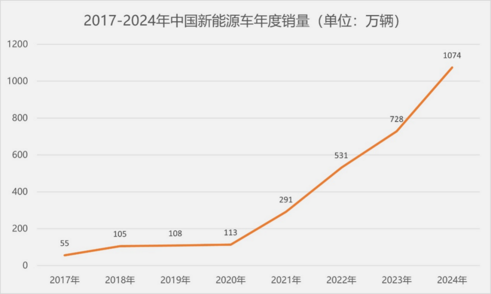 2021年则迎来巨变,销量跃升至291万辆,同比增长率超100%,市场由此开启爆发式增长。此后三年,2022年销售531万辆,2023年728万辆,2024年攀升至1074万辆。