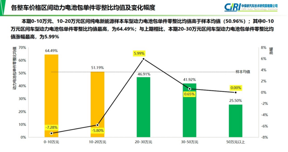 据中保研的数据显示,新能源车动力电池包的平均零整比为50.96%,这意味着其单件价格已超整车价值的一半。 尤为突出的是,在0-10万元价格区间的纯电动车型中,该比例高达64.49%。