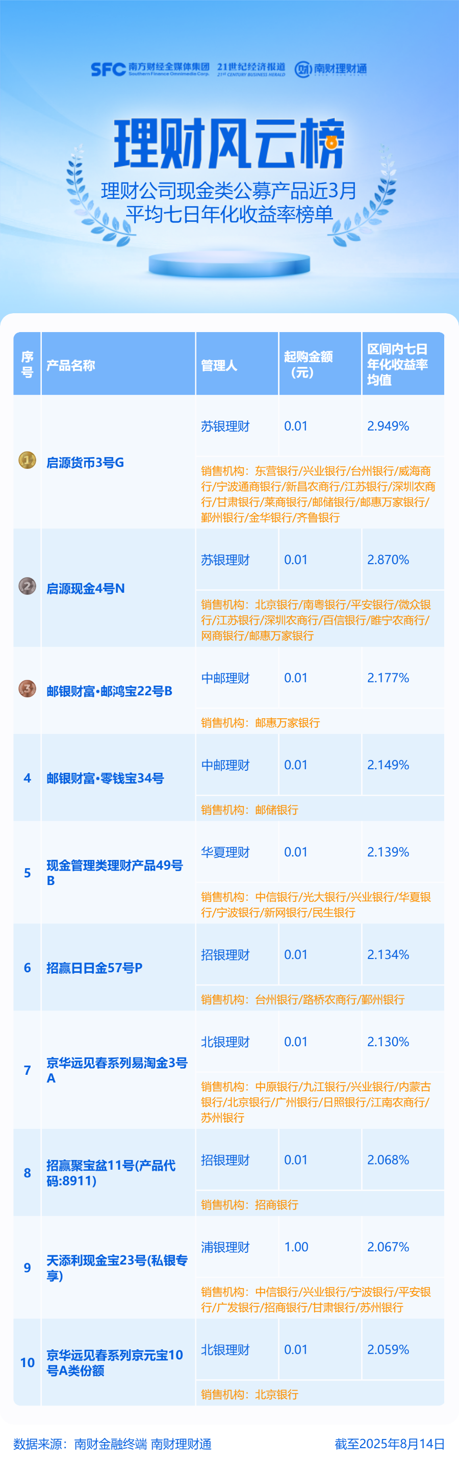 产品统计范围为理财公司发行的公募现金类产品,统计截止日期为2025年8月14日,统计区间为近3个月。