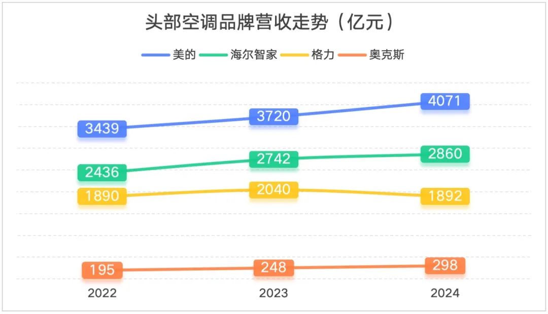 财务数据显示,2024年,美的、海尔智家、格力的营收分别约为4071亿元、2860亿元和1892亿元,均远高于奥克斯。同时,这三家的净利润分别达385亿元、187亿元和322亿元,比奥克斯29亿元的净利润高出一个数量级。