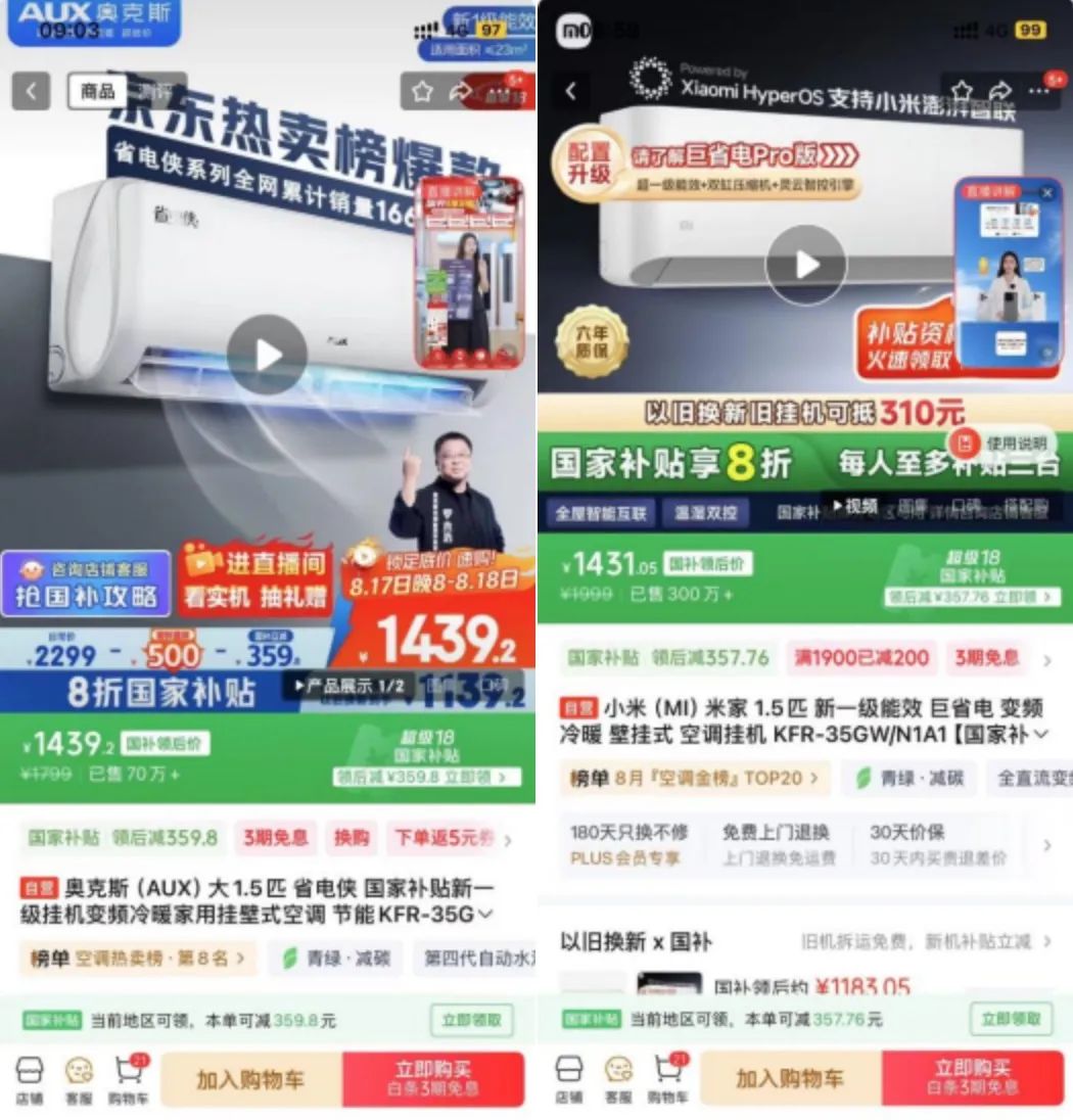 以海尔统帅、小米、奥克斯京东自营旗舰店为例,在制冷功率几乎相同的情况下,8月15日,奥克斯销量第一的是1.5匹的挂机,国补后售价1439元,销量50多万台。小米1.5匹的销冠卖出了300多万台,售价低至1431元;海尔统帅1.5匹挂机售价更低,只用1359元。