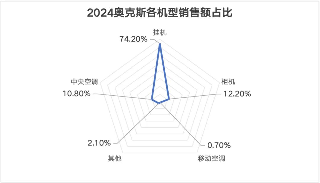 奥克斯的家用空调业务又可划分成挂机、柜机和移动空调三类,其中较低端的挂机业务贡献了74.2%的营收,相比之下,现在城市家庭装修流行的中央空调业务,营收占比仅为10.8%。根据中国家用电器协会的统计,2024年,中央空调的销售额占全行业的30.8%,是奥克斯的近三倍,从侧面反映出,奥克斯在高端市场相对乏力,更贴合下沉市场的需求,这也与奥克斯一贯以来的性价比路线相吻合。