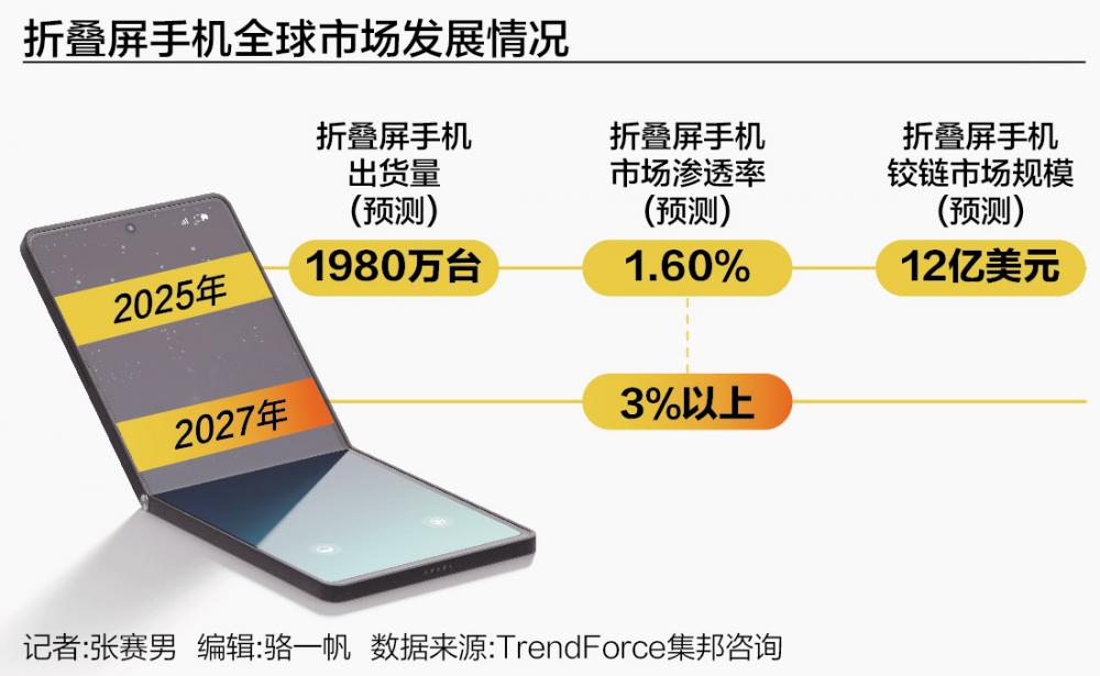 集邦咨询预计,2025年折叠手机出货量将达1980万台,渗透率约1.6%,与2024年持平。而苹果入局将助力折叠手机渗透率从2025年的1.6%提升至2027年的3%以上。