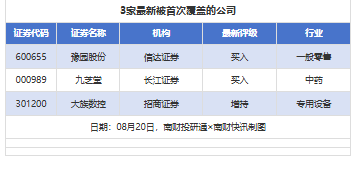 首次覆盖方面,8月20日券商共给出了3次首次覆盖,其中豫园股份获得信达证券给予“买入”评级,九芝堂获得长江证券给予“买入”评级,大族数控获得招商证券给予“增持”评级。