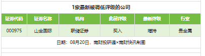 评级调低方面,8月20日,券商调低上市公司评级达到1家次,最新数据包括了联储证券对山金国际的评级从“买入”调低至“增持”。