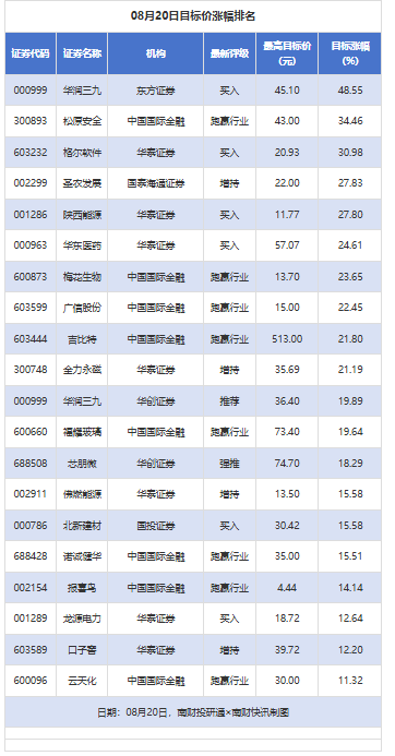 南财投研通数据显示,8月20日,券商给予上市公司目标价共26次,按最新收盘价计算,目标价涨幅排名居前的公司有华润三九、松原安全、格尔软件,目标价涨幅分别为48.55%、34.46%、30.98%,分别属于中药、汽车零部件、软件开发行业。