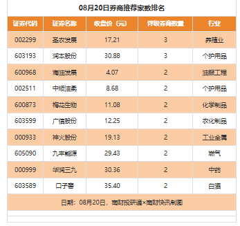 从券商推荐家数来看,8月20日有56家上市公司得到券商推荐,其中圣农发展获得3家推荐,润本股份获得3家推荐,海油发展获得2家推荐。
