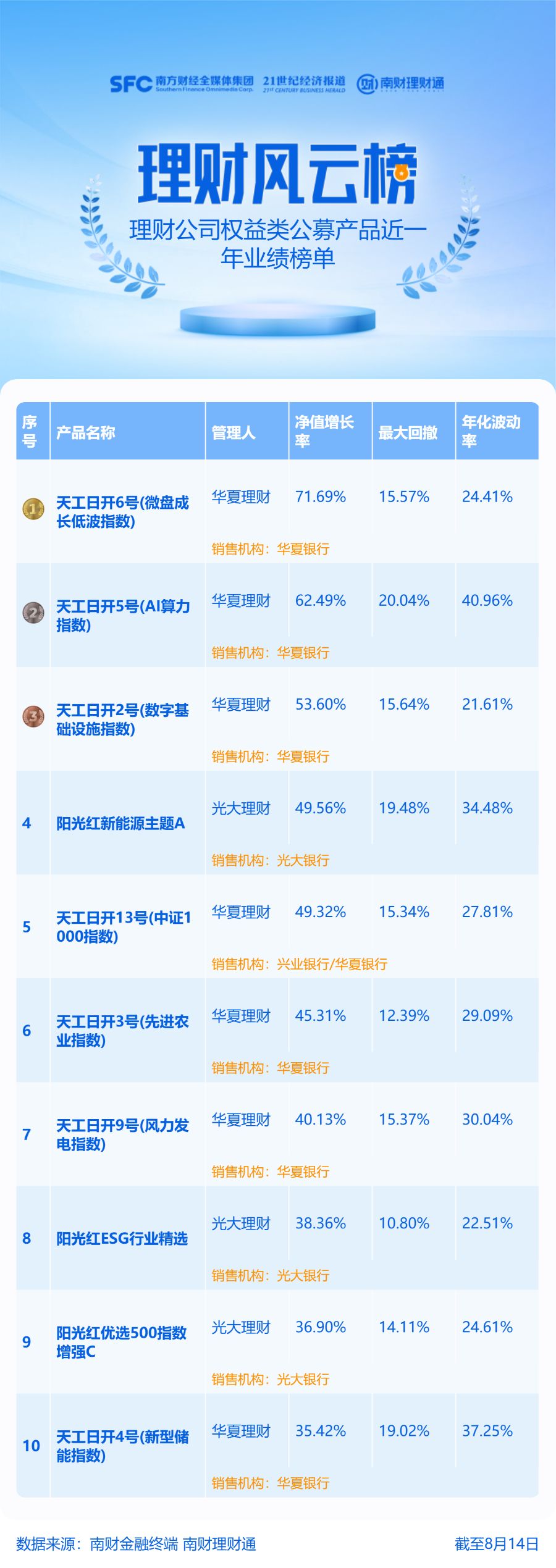 华夏理财“天工日开6号(微盘成长低波指数)”以71.69%的净值增长率位列第一,“天工日开5号(AI算力指数)”和“天工日开2号(数字基础设施指数)”位列第二和第三,近一年净值增长率分别为62.49%和53.6%。