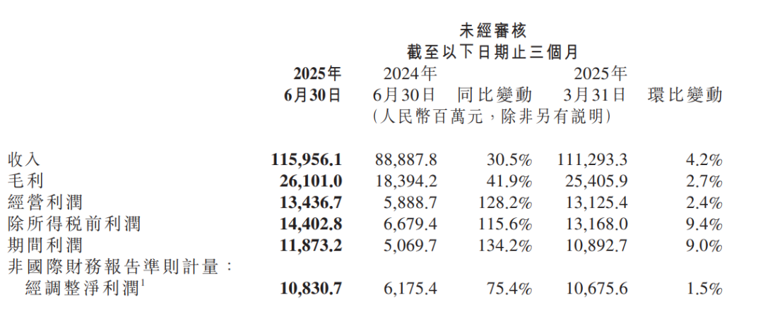 财报显示,2025年第二季度,小米营收1159.6亿元,同比增长30.5%,连续3个季度突破千亿;经营利润134.4亿元,同比增长128.2%;经调净利润108.3亿元,同比增75.4%,连续2个季度突破百亿。